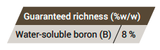 K-Bora G es un corrector líquido complejo de deficiencia de boro, diseñado para aplicaciones foliares. Está formulado con agentes complejantes que lo hacen completamente asimilable por la planta. K-Bora G actúa como un suplemento nutricional de uso foliar, con una fuente de boro de rápida asimilación, indicado tanto para tratamientos preventivos como correctivos de deficiencias.
