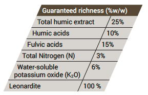 Leonardite Humic Acids K-X-Hum is a liquid soil improver based on humic acids, obtained from highly humified lignites (Leonardite). Net Mass: